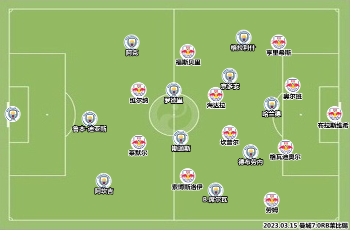 首回合較量,RB萊比錫采取了保守的防御策略,切斷了哈蘭德身后的運輸線,英超射手王全場僅獲得1次射門機會。做客伊蒂哈德,RB萊比錫的策略是囤兵中場,陣型和防守模式沒有太大變化,曼城通過“五中場”搶占中路空間,利用套邊傳中和長傳打身后等方式為哈蘭德輸送炮彈。
