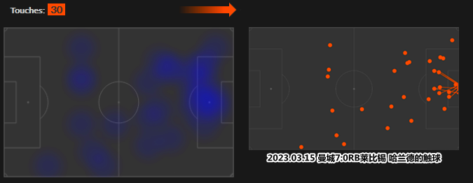 進入2023年以來,曼城陷入了一種整體控球率越高、傳球次數越多,哈蘭德存在感就越低、表現越低迷的怪圈。首回合做客萊比錫之前,曼城在對陣諾丁漢森林時遭遇系統局,控球率高達73%,射門次數6倍于對手(23-4),最終只拿到了1分。曼城全隊完成712腳傳球,哈蘭德只有10次傳球,觸球次數17次,完全游離于體系之外。做客萊比錫,曼城的傳球總數達到了700次,哈蘭德有14次傳球和22腳觸球,依然是場上“觀眾”。