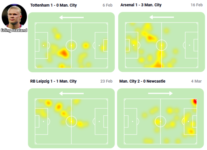 上周末對陣水晶宮,哈蘭德打入1粒點球,運動戰表現一般。曼城的傳球總數達到了640次,哈蘭德僅有10次傳球和22腳觸球,9次丟失球權,同隊友之間的聯系幾乎被切斷。更早的一輪聯賽對陣紐卡斯爾,曼城只錄得536次傳球,哈蘭德的存在感(19腳傳球29腳觸球)卻有所提升。此役,曼城完成596腳傳球,哈蘭德在63分鐘的出場時間里就觸球26次、傳球16次,比賽參與度達到了近期的峰值,瓜迪奧拉的操作證明了靠堆積中場的方式,完全能夠兼顧控球和提速。