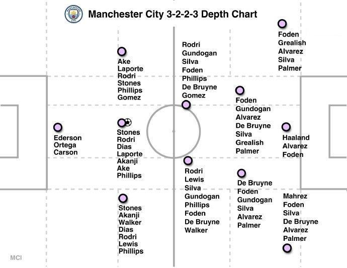 (圖)曼城陣容兼容性很強,球員普遍具有多面手屬性,可用之人不多但“深度”依然非??捎^,阿爾瓦雷斯和福登可以在3241陣型中找到位置。