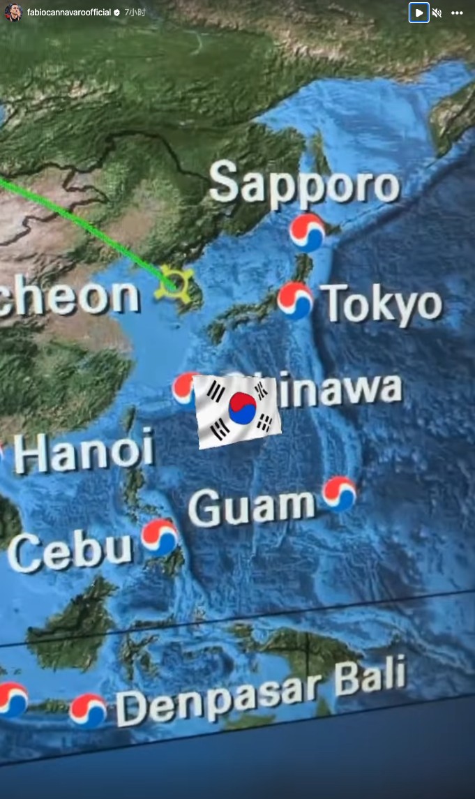 卡納瓦羅社媒曬照,卡納從羅馬飛往韓國仁川。瓦羅往韓
