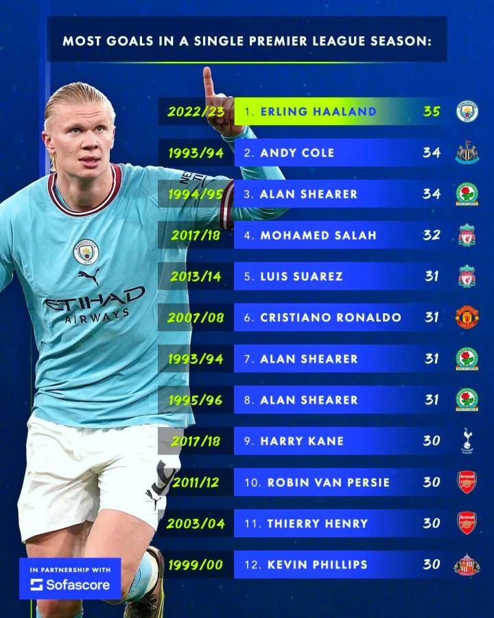 哈蘭德還沒有打完整個賽季,哈蘭封頂英超射手榜,德還打完