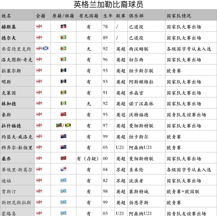 加勒比海及北美其他地區后裔的加勒及北英格蘭球員