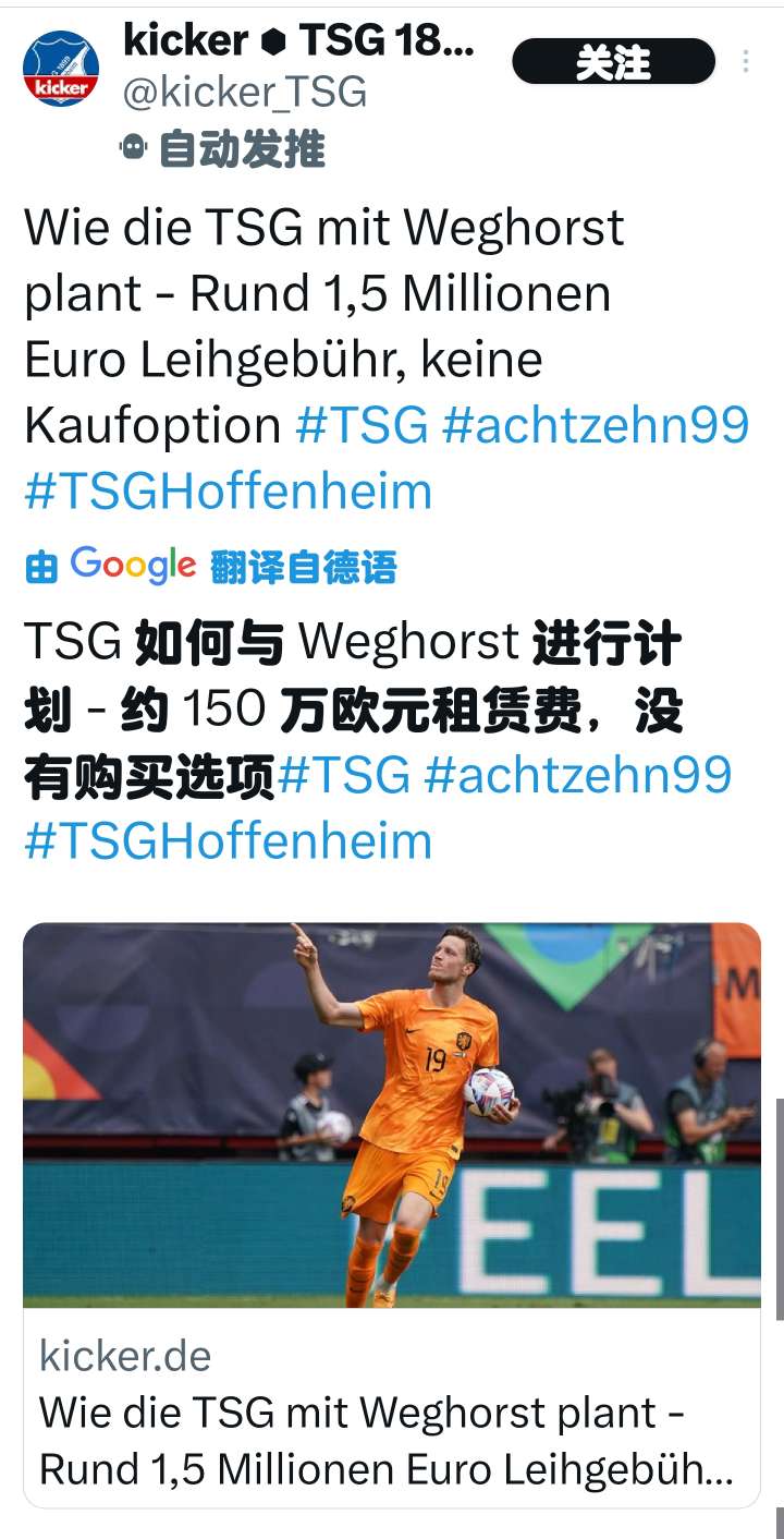 和羅馬傳過緋聞的和羅荷蘭霍荷蘭前鋒韋格霍斯特已經官宣租借去了霍芬海姆。根據德國媒體踢球者披露,馬傳