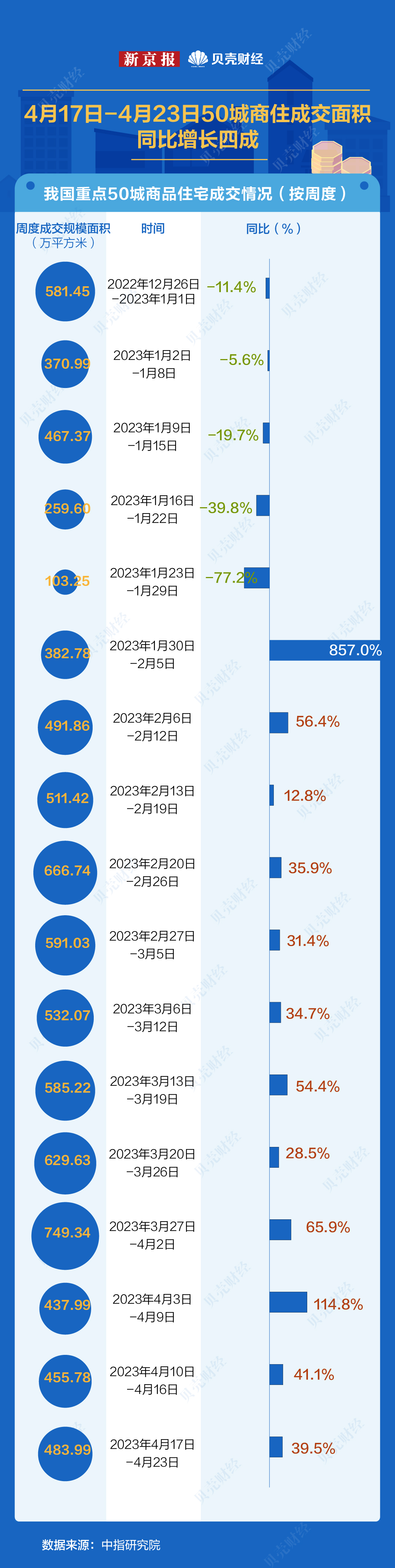 中指研究院數據顯示,4月首周,重點50城商品住宅成交面積環比出現大幅下降,近兩周成交規模略有回升,2023年第17周(4月17日-4月23日),重點50城商品住宅成交484萬平方米,環比增長6.2%,同比增長近四成。