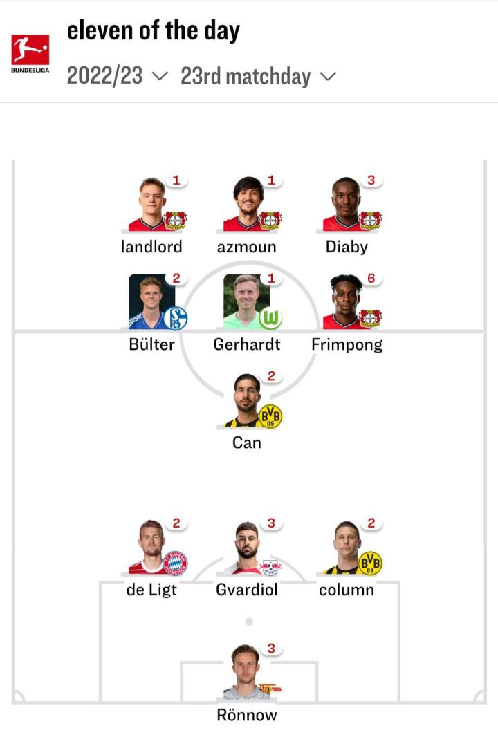 德国媒体kicker评选德甲第23轮最佳阵容,伊...