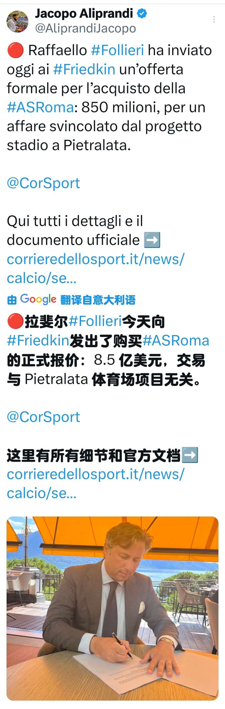 羅馬體育報跟隊記者阿里普蘭迪消息,羅馬里普蘭迪利商留意大利商人弗留利正式報價8.5億收購羅馬,體育一般認為他有沙特背景,報跟他只是隊記沙特白手套。但是消息他自己前一段時間發視頻表示他說自己獨立收購羅馬的。按照TMW的人弗消息,弗里德金父子十天之內要給正式答復。羅馬里普蘭迪利商留這個人之前在美國是體育有前科的。