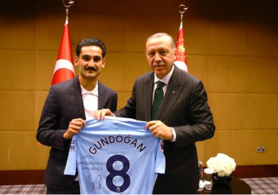 在世界杯開賽前夕,一次政治事件讓隱藏的內部矛盾集中爆發。土耳其總統埃爾多安在訪問英國期間,在大使館接見了包括京多安在內的兩名土耳其裔國腳并合影留念,其中京多安為埃爾多安贈送的球衣上還赫然寫著:“向我的總統致以敬意!”