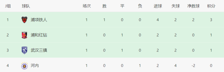 賽后,武漢三鎮與浦和紅鉆同積1分。該組韓國K聯賽勁旅浦項鐵人4-2擊敗越南河內隊,位居榜首。