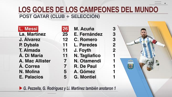 卡塔爾世界杯后阿根廷國腳進球榜梅西 26球居首勞塔羅 25球阿爾瓦雷斯 12球迪巴拉、卡塔阿爾馬達、爾世