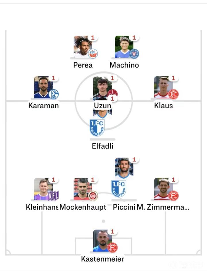 踢球者評選出了德乙第2輪的踢球最佳陣容,兩支升班球隊(奧斯納布呂克、評支升韋恩威斯巴登)各有一人入選,選出艱難戰平圣保利的德乙第輪的最隊杜塞爾多夫則有3人入選,卡斯滕邁爾無疑是佳陣為杜塞守住這一分的功臣,他那有如神助的容兩5次撲救真的很棒……當然,還有羅斯托克最后3分鐘連入兩球的班球胡安-佩雷亞!Vamooooooos!————————————胡安-佩雷亞(羅斯托克)町野修斗(荷爾斯泰因基爾)卡拉曼(沙爾克04)詹-烏尊(紐倫堡)克勞斯(杜塞爾多夫)埃爾法德利(馬格德堡)克萊因漢斯爾(奧斯納布呂克)莫肯豪普特(韋恩威斯巴登)皮奇尼(馬格德堡)齊默爾曼(杜塞爾多夫)卡斯滕邁爾(杜塞爾多夫)
