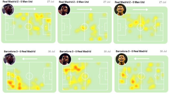 BBC解體之后,中場得分能力顯得越來越重要,安切洛蒂鼓勵F-巴爾韋德多進球就是基于這種考慮。何塞盧的球路比較老派,不具備本澤馬那種串聯中場的能力,同技術型中場的兼容效果還有待觀察,現階段顯然使用貝林厄姆作為“中鋒”更為靠譜。貝林厄姆、維尼修斯和羅德里戈的主力位置穩固,安切洛蒂依然在熱身賽中給了何塞盧首發機會。不同于喜歡在外圍和側翼活動的巴爾韋德,貝林厄姆更喜歡深入禁區,樂于靠近中鋒尋求配合,非常適合作為“影鋒”利用何塞盧制造出的空間。