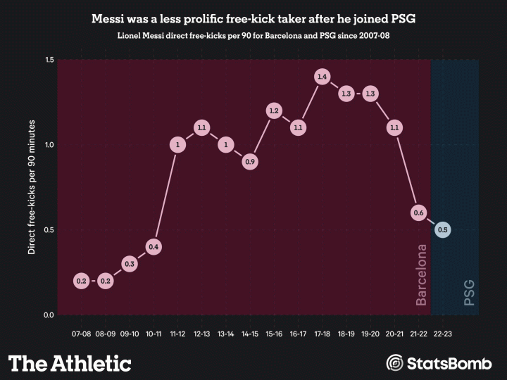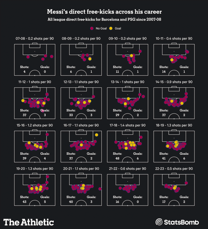 職業生涯至今,梅西每90分鐘的任意球主罰次數