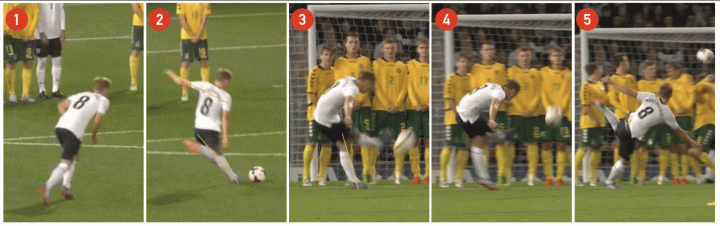 在射門時,沃德-普勞斯總是弓著身子,他的任意球嘗試也總是如出一轍的上旋球。隨著生涯的發展,梅西的上半身移動幅度更加緊湊。射門動作結束后,沃德-普勞斯的雙腳會整體騰空,而梅西的右腳不會離開地面,他會把右腳滑開,為左腳著地騰出空間(圖5)。