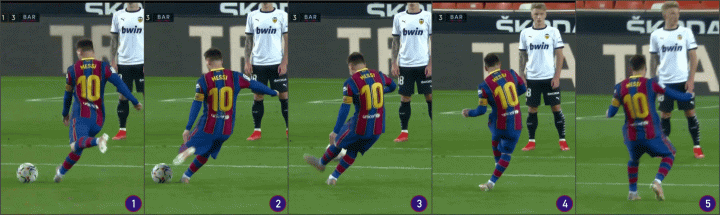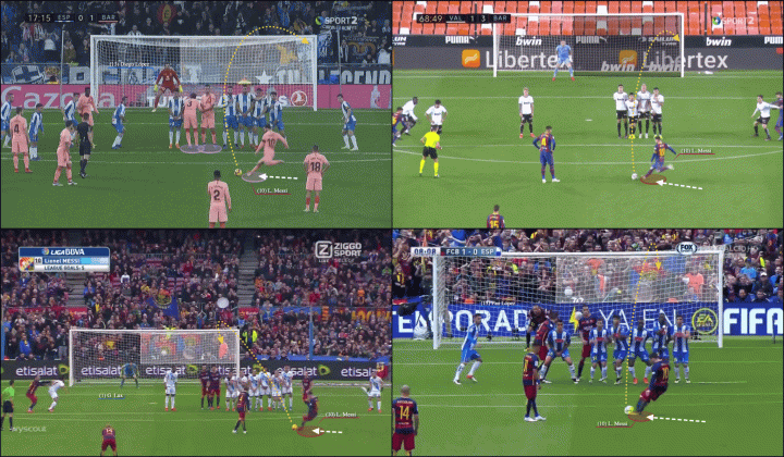 從生物力學角度來看,梅西的任意球腳法頗具意味——無論運用的腳法如何,無論如何變化,都是萬變不離其宗的。這讓對方門將很難讀懂他的意圖。