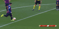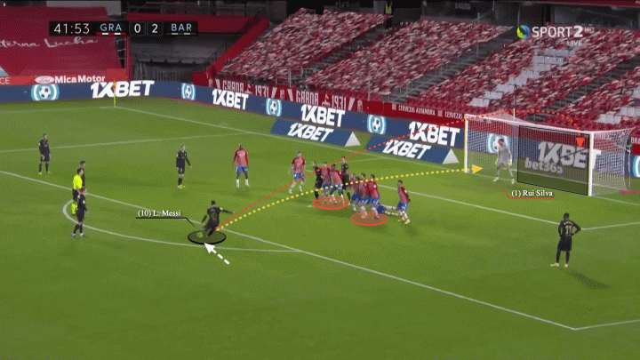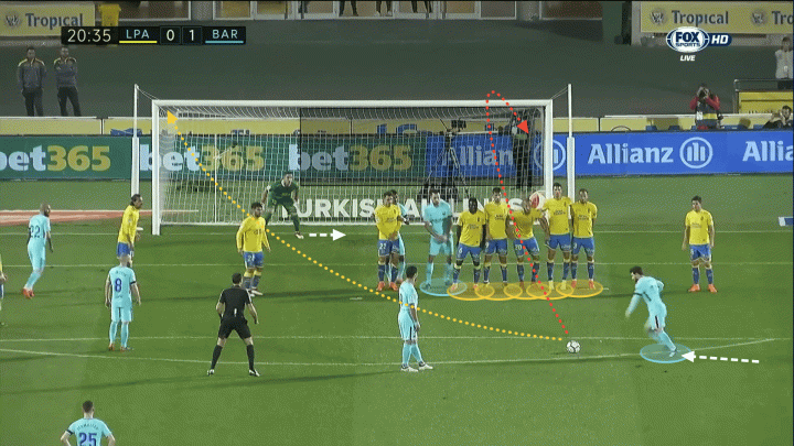 2018年對拉斯帕爾馬斯首開紀錄,(注:靜態圖的紅色箭頭表示門將預判的射門路線,橙色箭頭為梅西實際的射門路線,下同。請留意門將與球門的相對位置。)