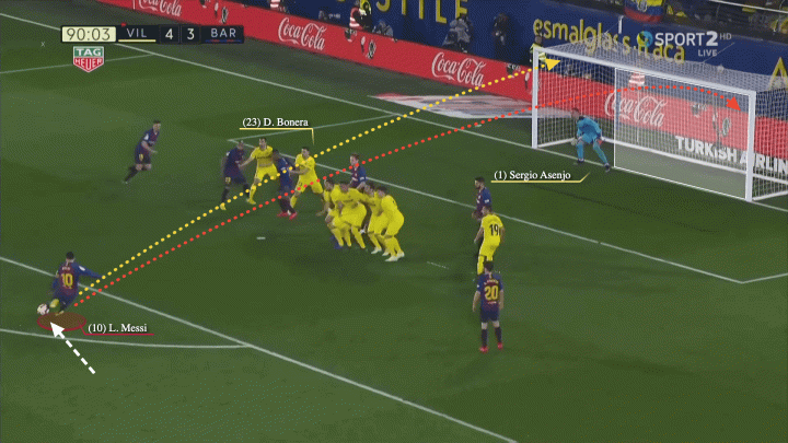 2015年歐洲超級杯對陣塞維利亞,梅西打進的第二個任意球,也是類似的軌跡,