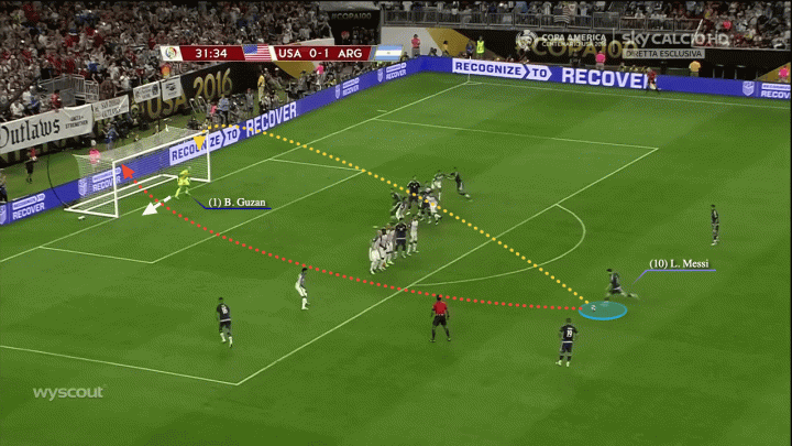 這個防守回合,人墻的布置給了梅西直接打右路的機會。美國隊門將布拉德-古贊也是這么想的,他甚至提前在門線上調整步點。然而哨聲剛落,梅西卻反其道而行之,將球射向球門左上方的死角。這是絕對意義上的十分角,幾乎命中了橫梁與立柱相交的直角。