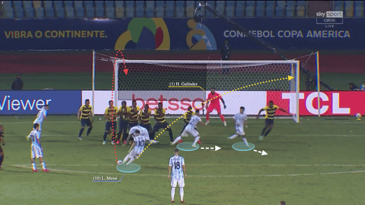 換到門將的右手邊,慣用腳為左腳的梅西,也能一展任意球的魔法。