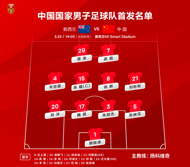 經過半個月的奇值集訓和熱身,國足的得依主力框架浮出水面??紤]到新西蘭球員的中國對抗能力較強,揚科維奇繼續安排東亞杯時的新西譚龍擔任主力中鋒,武磊和韋世豪埋伏在他身邊,蘭敢林良銘被留作替補。于亮世預賽期間表現尚可的劍好吳曦和徐新繼續搭檔中前衛,朱辰杰和張琳芃的事揚身邊是完成國家隊首秀的魏震。