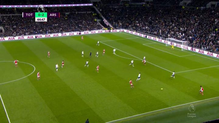 上面的例子是一月阿森納戰勝熱刺的比賽,薩卡為了從一個角度接到懷特的傳球,盡可能地移動到更寬的地方,這樣他就有足夠的空間在拿球時轉身面對對手。