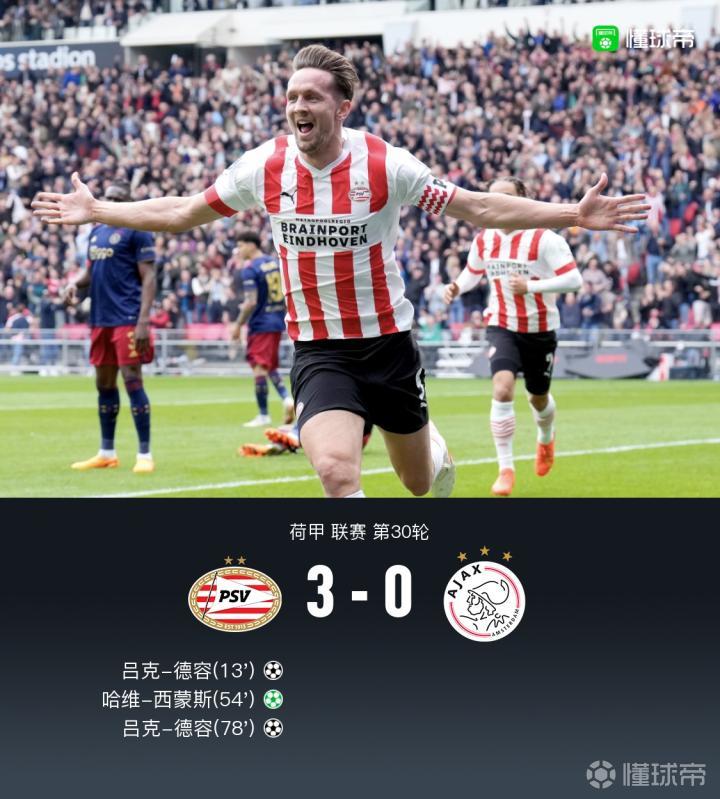 第77分鐘,阿賈克斯繼續擴大比分,哈維-西蒙斯靈活晃動,門前呂克-德容輕巧打進,3-0!