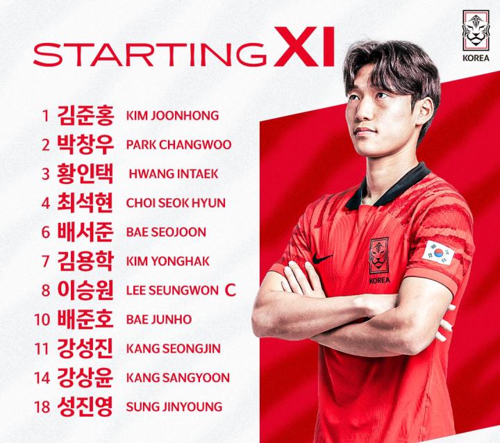 韓國中后場部分輪換 要打國青邊路了門將:1-金峻弘后衛:6-裴瑞峻,韓國換打 4-崔碩賢,中后3-黃仁澤,場部2-樸昶佑中場:10-裴俊浩,分輪14-姜尚潤,國青8-李承原,邊路7-金龍鶴中鋒:18-成鎮煐 ,韓國換打11-姜成進
