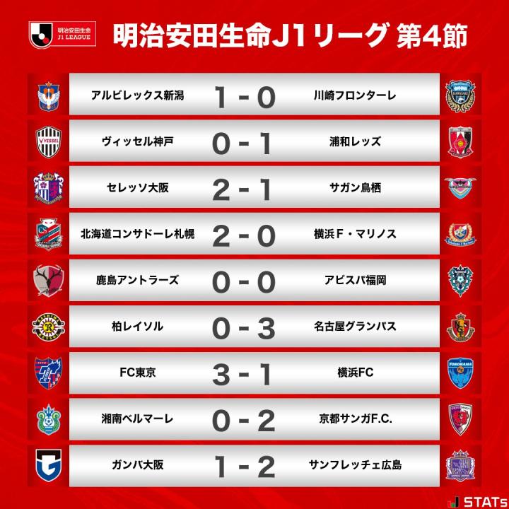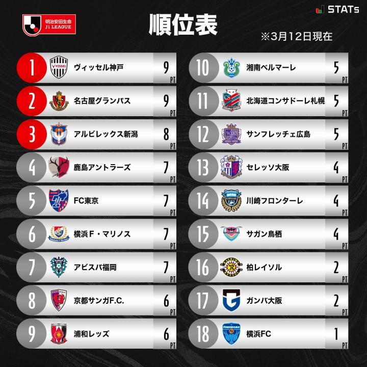 2023賽季J1聯賽第4輪戰罷最新積分榜。賽季賽第