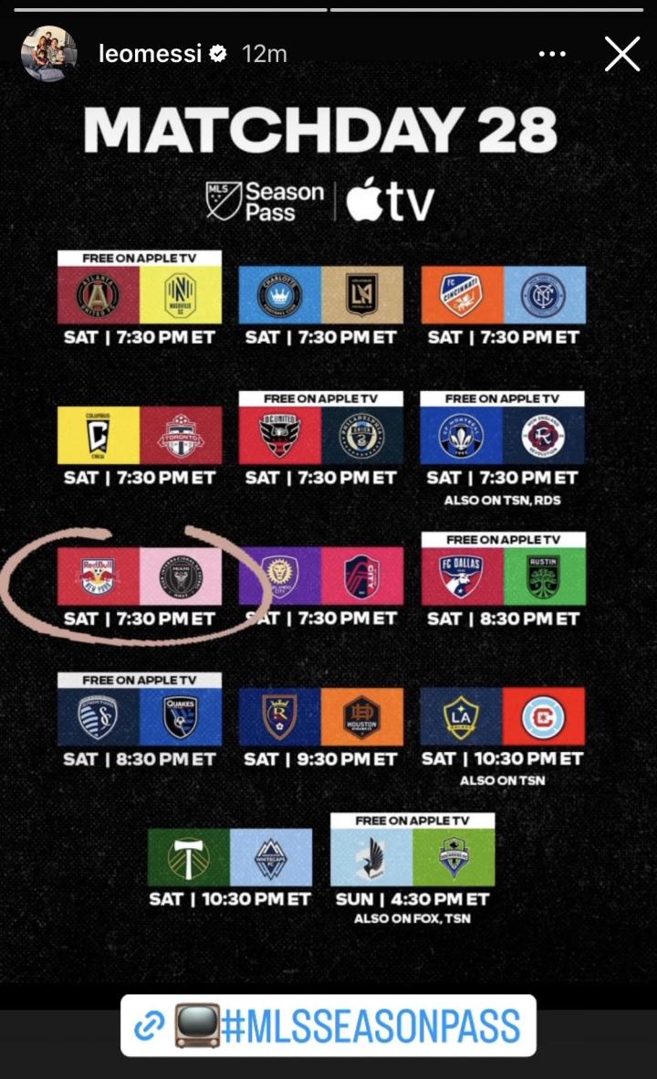来看我美职联首秀?梅西社媒晒Apple TV美职联第28轮赛程海报