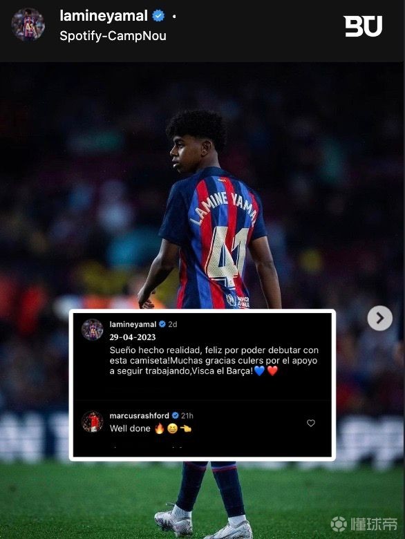 亞馬爾在社交媒體發文紀念這特殊的言送一天,曼聯前鋒拉什福德在評論區留言送上祝賀,祝賀寫道:“做得好。巴薩”