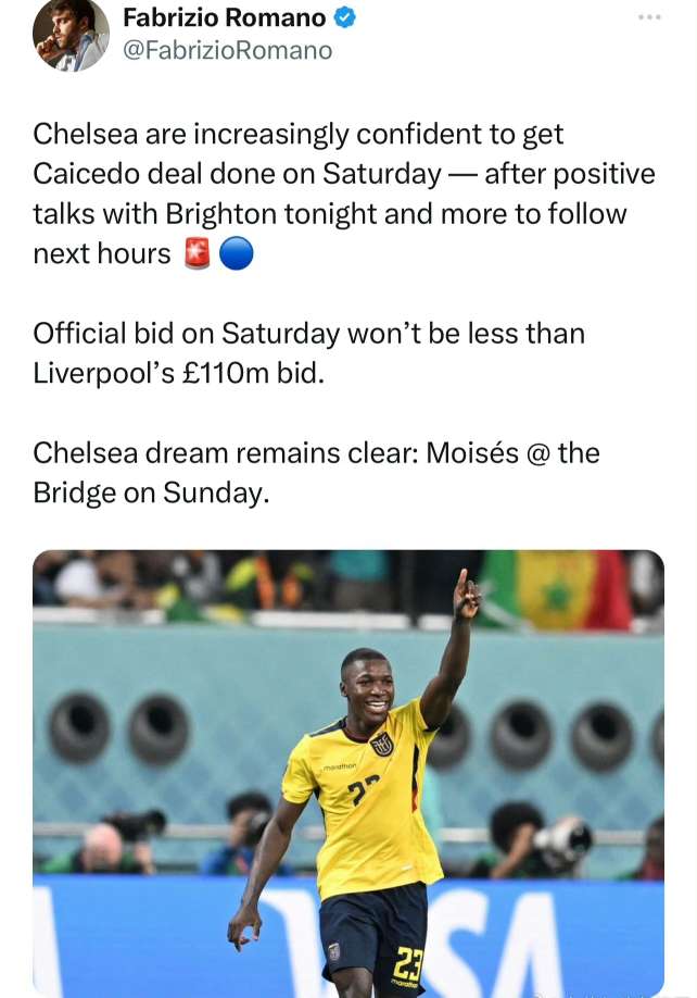 羅馬諾消息表示,羅馬萊頓切爾西在今晚和布萊頓的諾消溝通之后,他們對于在周六完成凱塞多的息表轉會有很大的信心。在周六送上的示切官方報價不會低于此前利物浦的1.1億英鎊,切爾西的爾西愿望還在,那就是今晚凱塞多周日在斯坦福橋正式亮相。