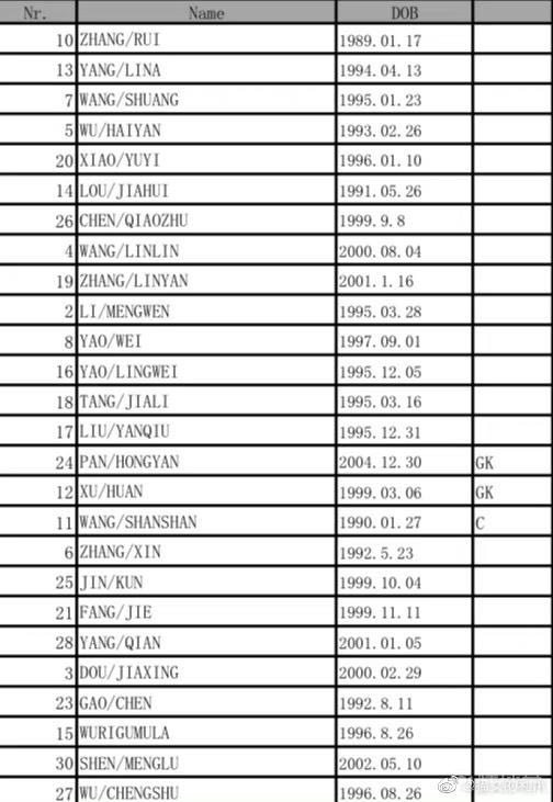 中國女足熱身賽號碼??王霜回歸 7號 金坤25號 方潔21號 楊倩28號 竇加星3號 烏日15號 沈夢露首次入選 30號