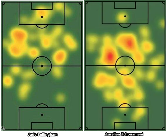 (圖)同首輪比賽時相比,貝林厄姆參與后場防守的頻度有所降低,球員們還需要適應菱形中場的運作方式。