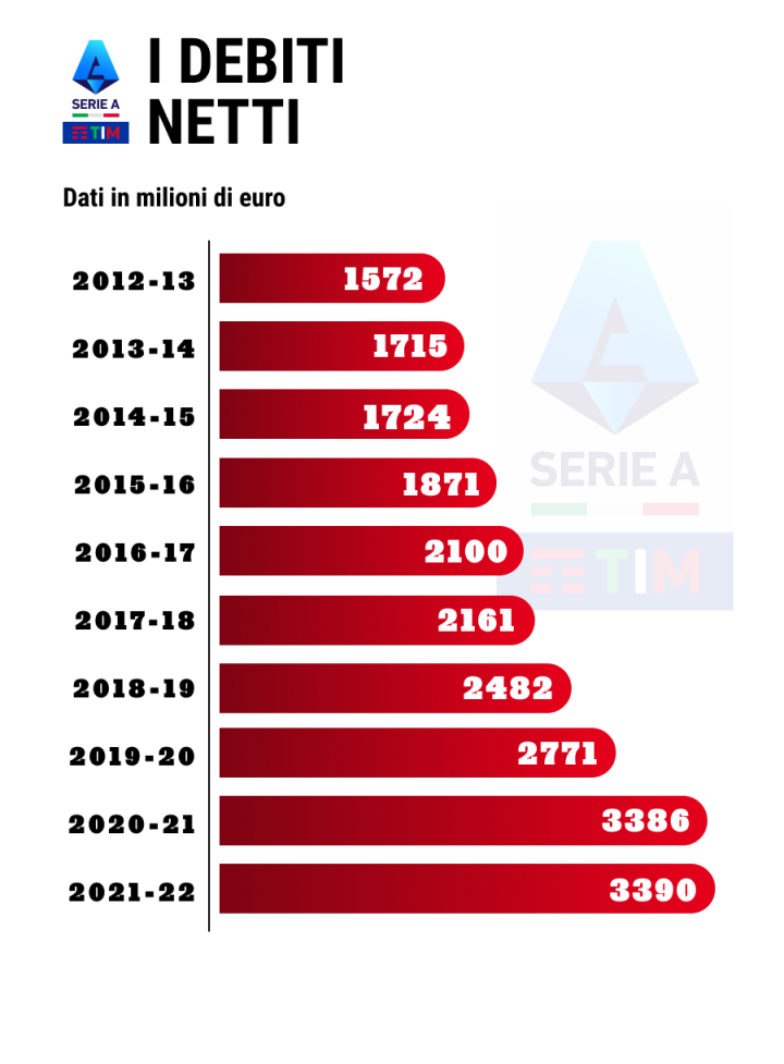 上圖為歷年意甲凈債務總額,單位百萬歐元