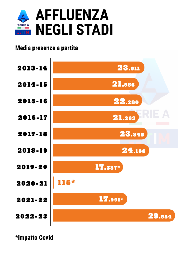 至少在上賽季中,全球觀眾增加了10%(亞洲增加了35%,歐洲增加了18%),意大利的球迷也回到了體育場。每場比賽的平均上座人數接近3萬名觀眾,這是8年來的最高紀錄。