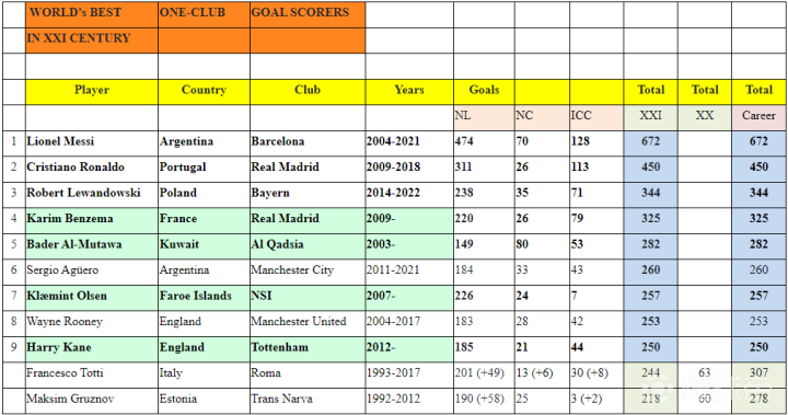 一年多已經過去了 這些球員僅有一人還能繼續刷新數據IFFHS2022年8月22日文章 二十一世紀為單家俱樂部打進最多進球的年多能繼球員1 里奧內爾·梅西(阿根廷) 巴塞羅那(西班牙) 2004-2021 672球 (梅西當時效力于法國巴黎圣日耳曼 現效力于美國邁阿密國際)2 克里斯蒂亞諾·羅納爾多(葡萄牙) 皇家馬德里(西班牙) 2019-2018 450球 (C羅當時效力于英格蘭曼徹斯特聯 現效力于沙特利雅得勝利)3 羅伯特·萊萬多夫斯基(波蘭) 拜仁慕尼黑(德國) 2014-2022 344球 (萊萬當時已轉會至西班牙巴塞羅那)4 卡里姆·本澤馬(法國) 皇家馬德里(西班牙) 2009- 325球 (本澤馬現效力于沙特阿拉伯吉達聯合)5 巴德爾·阿爾-穆塔瓦(科威特) 科威特卡迪西亞(科威特) 2003- 282球 (巴德爾目前仍效力于科威特卡迪西亞)6 塞爾吉奧·阿圭羅(阿根廷) 曼徹斯特城(英格蘭) 2011-2021 260球 (阿圭羅2021年底退役)7 克萊門特·安德拉松·奧爾森(法羅群島) 魯納維克(法羅群島) 2007- 257球 (安德拉松現效力于冰島科帕沃于爾光明宮)8 韋恩·魯尼(英格蘭) 曼徹斯特聯(英格蘭) 2004-2017 253球 (魯尼2021年初退役)9 哈里·凱恩(英格蘭) 托特納姆熱刺(英格蘭) 2012- 250球 (凱恩現效力于德國拜仁慕尼黑)- 弗朗西斯科·托蒂(意大利) 羅馬(意大利) 1993-2017 307球 (21世紀打進244球 托蒂2017年初退役)- 馬克西姆·格魯茲諾夫(愛沙尼亞) 納爾瓦運輸(愛沙尼亞) 1992-2012 278球(21世紀打進218球 格魯茲諾夫2013年初退役)