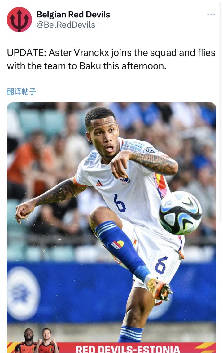 比利時國家隊大名單更新:弗蘭克斯再次從U21升入成年隊,比利將隨隊前往巴庫。時國斯再U升
