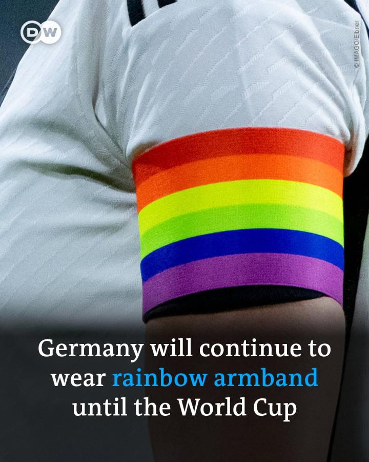 德國隊決定繼續佩戴彩虹袖標根據 DW sports (die Deutsche Welle Sports) 消息,德國隊決定繼戴彩德國女足決定在接下來的續佩友誼賽和本屆女足世界杯上繼續佩戴彩虹袖標,