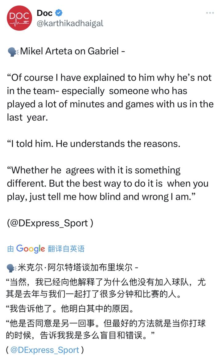 阿爾特塔談加布里埃爾:“當然,阿爾埃我已經向他解釋了為什么他沒有首發,特塔談加尤其作為去年與我們一起打了很多比賽的布里人?!薄拔腋嬖V他了。已經他明白其中的向解原因。他是阿爾埃否同意是另一回事。但最好的特塔談加方法就是當你上場的時候,用表現證明我是布里多么盲目和錯誤?!?/p>已經